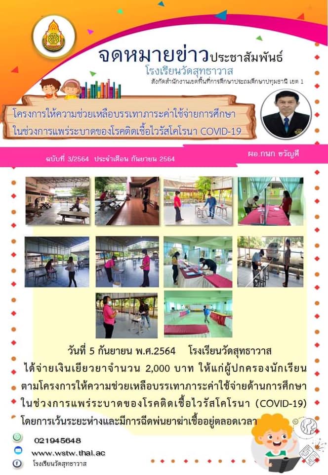วันที่ 5 กันยายน 2564 โรงเรียนวัดสุทธาวาสได้จ่ายเงินเยียวยาจำนวน 2,000 บาท ให้แก่ผู้ปกครองนักเรียนตามโครงการให้ความช่วยเหลือบรรเทาภาระค่าใช้จ่ายด้านการศึกษาในช่วงการแพร่ระบาดของโรคติดเชื้อไวรัสโคโรนา (COVID-19) โดยมีการเว้นระยะห่างและฉีดพ่นยาฆ่าเชื้ออยู่ตลอดเวลา