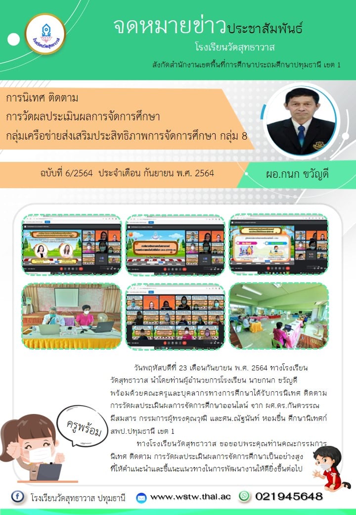 ทางโรงเรียนวัดสุทธาวาส นำโดยท่านผู้อำนวยการโรงเรียน นายกนก ขวัญดี พร้อมด้วยคณะครูและบุคลากรทางการศึกษา ได้รับการนิเทศติดตาม การวัดผลประเมินผลการจัดการศึกษาออนไลน์